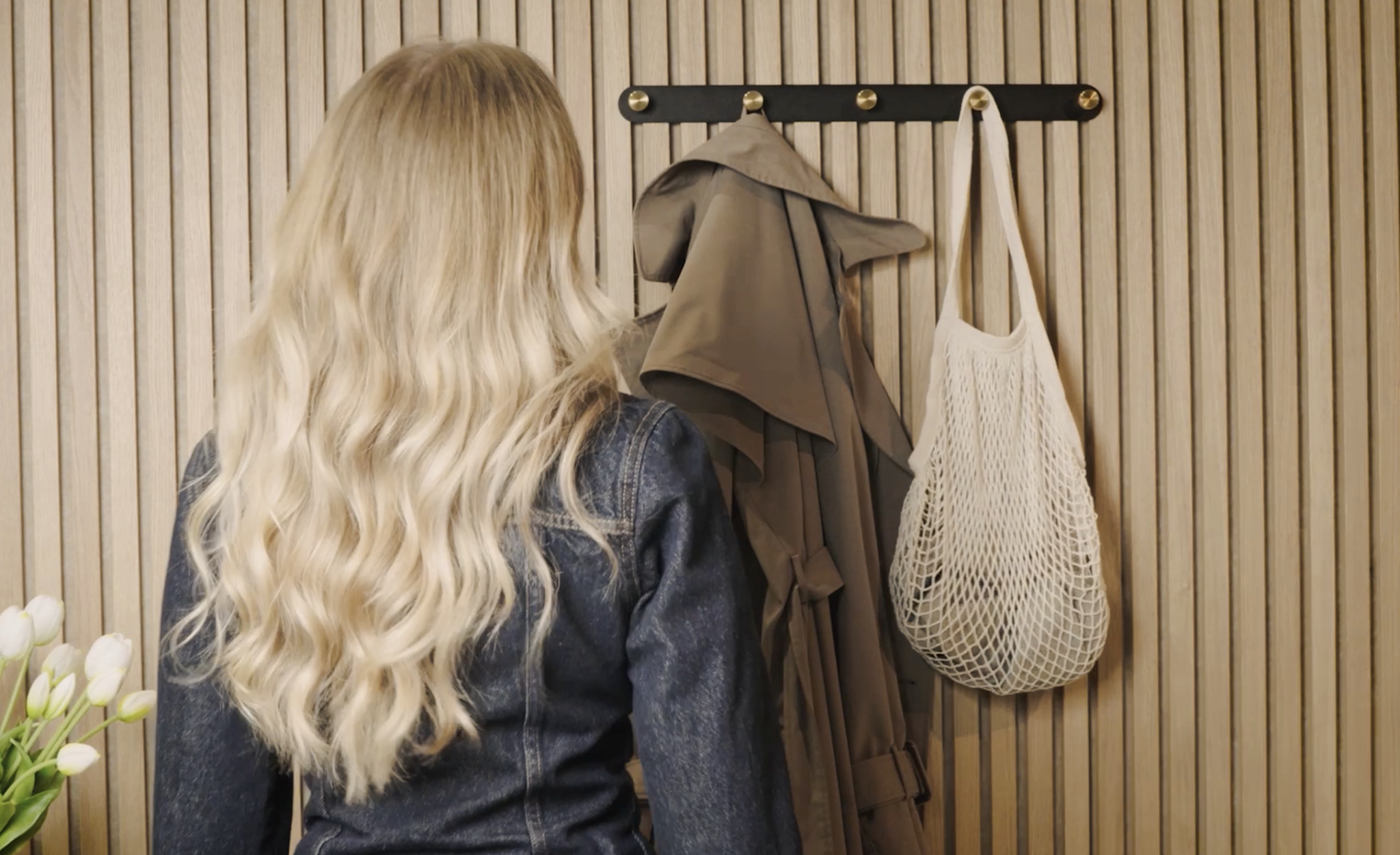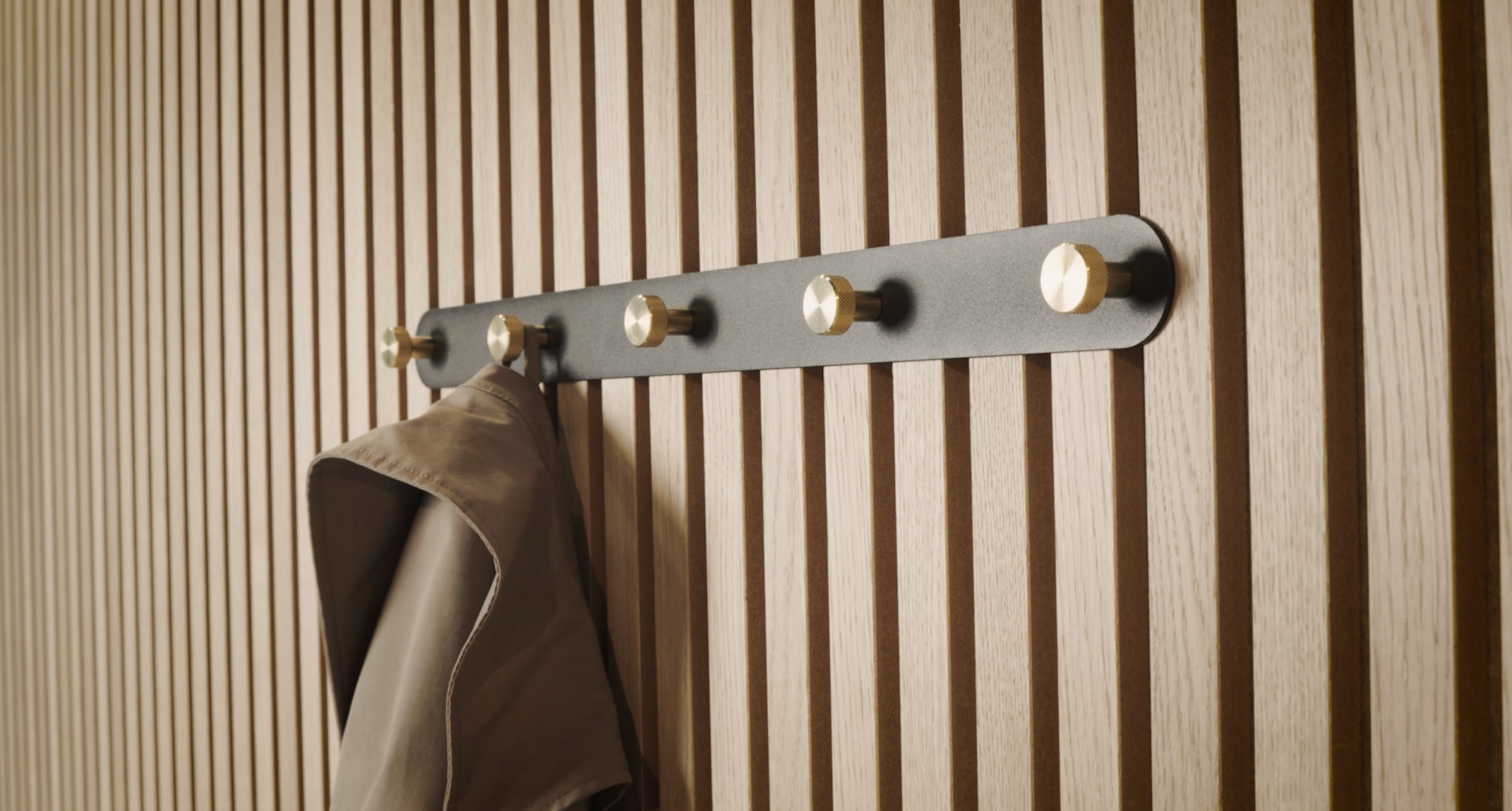 Die Garderobenleiste aus schwarzem, pulverbeschichtetem Stahl hält Jacken, Taschen, Schals – einfach alles.
