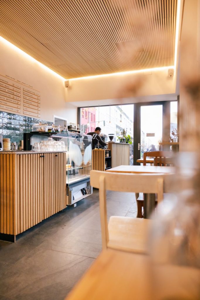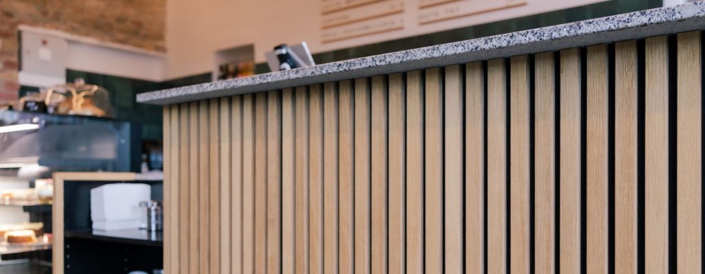 Beim Umbau des Cafè’s hat Jonathan sich für die WoodUpp Paneele in Eiche Klassisch mit schwarzem Filz entschieden. Diese wurden an der Decke sowie im Tresenbereich verwendet und kreieren eine ganz besondere, gemütliche und einladende Atmosphäre.