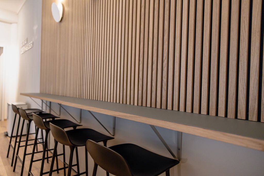 Am Ende war klar, eine Lamellenwand aus Holz soll das Büro verschönern.