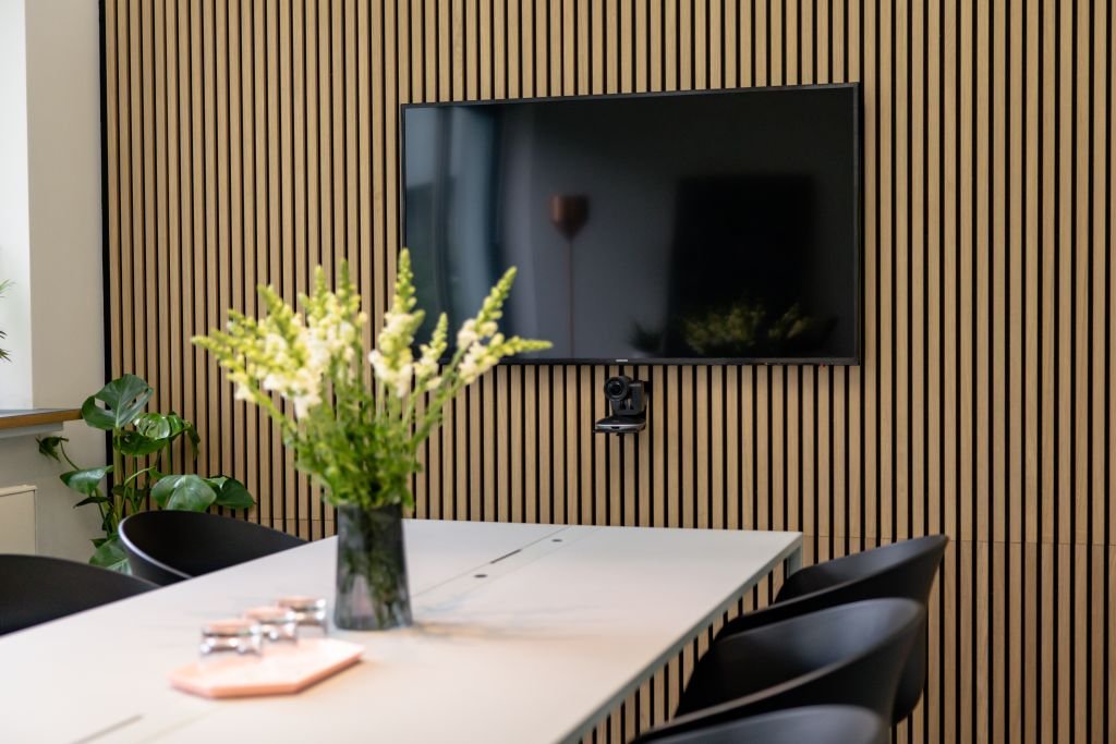 Mach ein Foto, wähle ein Modell und sieh Dir dieses an Deiner Wand an. Im Bureau Oberhaeuser wurde das Modell Akupanel | Eiche Klassisch mit dem schwarzen Filz gewählt.