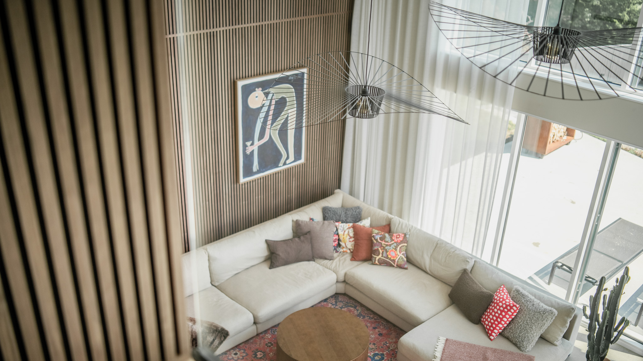 Die Familie wohnt in einem modernen Haus mit offenem Grundriss, hohen Decken und Betonböden – eine Kombination, die einige Herausforderungen in Bezug auf Klang und Akustik mit sich brachte.