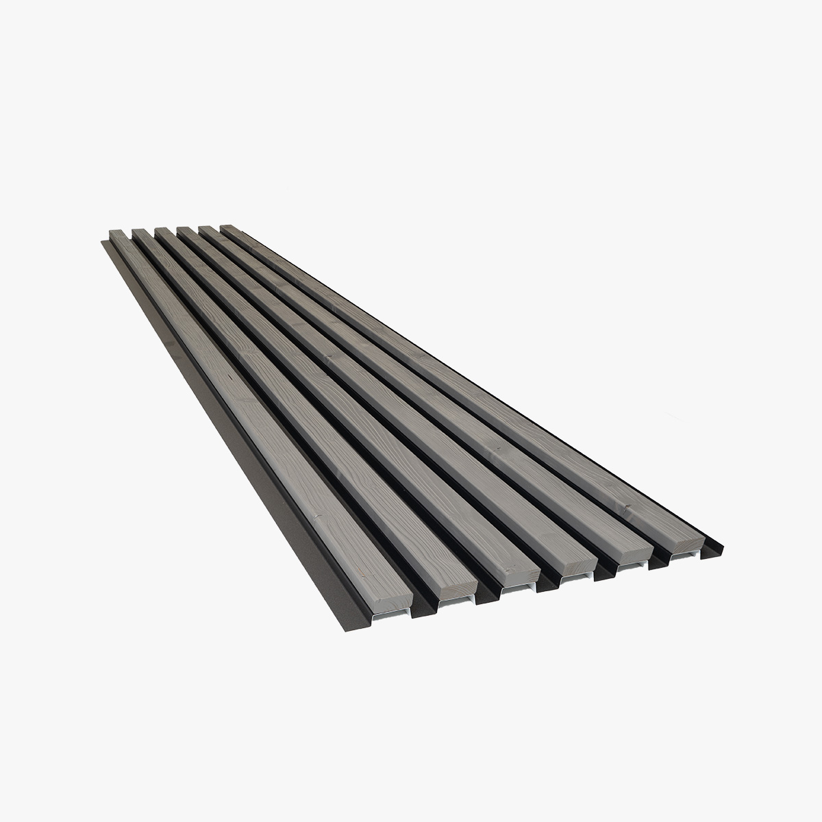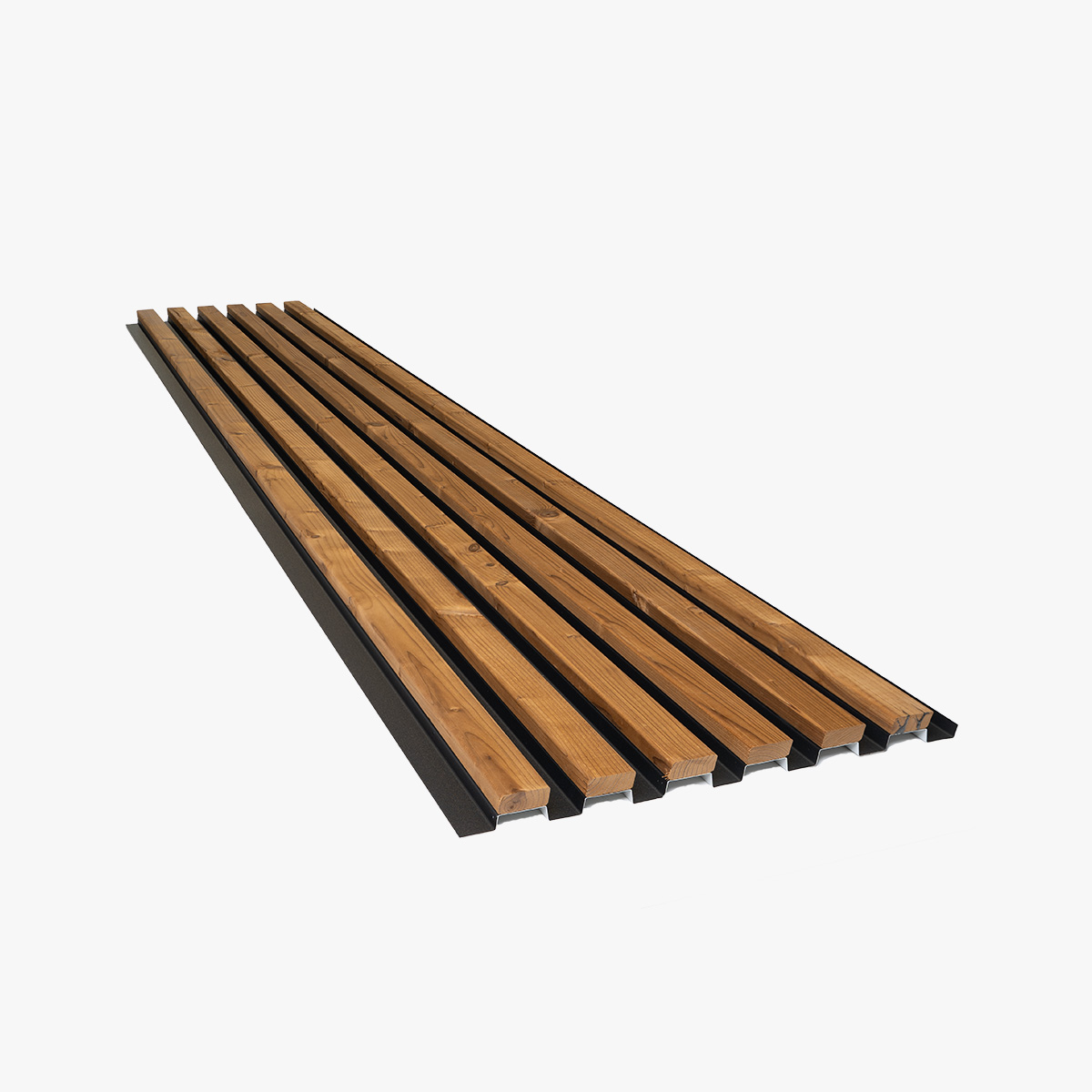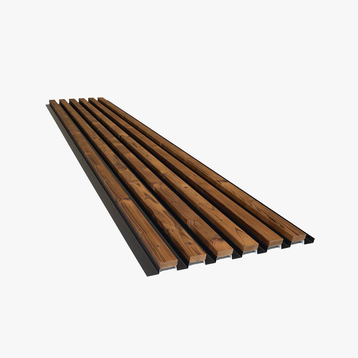 Thermisch behandelte Fichtenlatten sind mit einer pulverbeschichteten Aluminiumrückseite verbunden – eine Konstruktion, die in Skærbæk, Dänemark, entwickelt und hergestellt wurde. Das Ergebnis ist die Wärme und die Maserung von echtem Holz, gehalten von einer Struktur, die sich nicht verzieht, verdreht oder durchhängt.