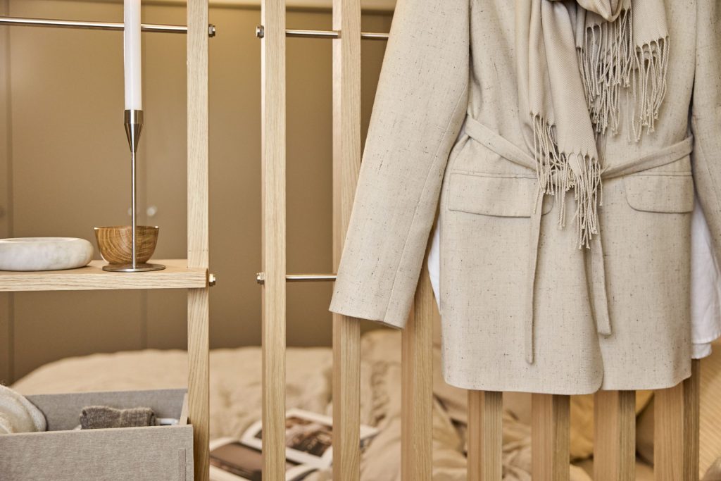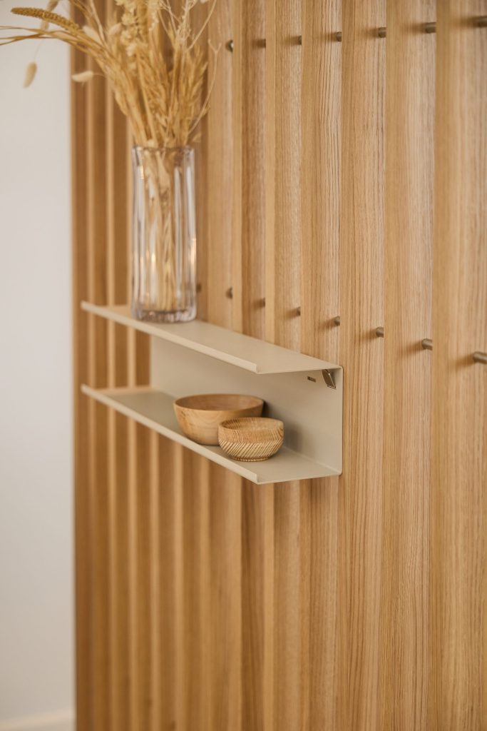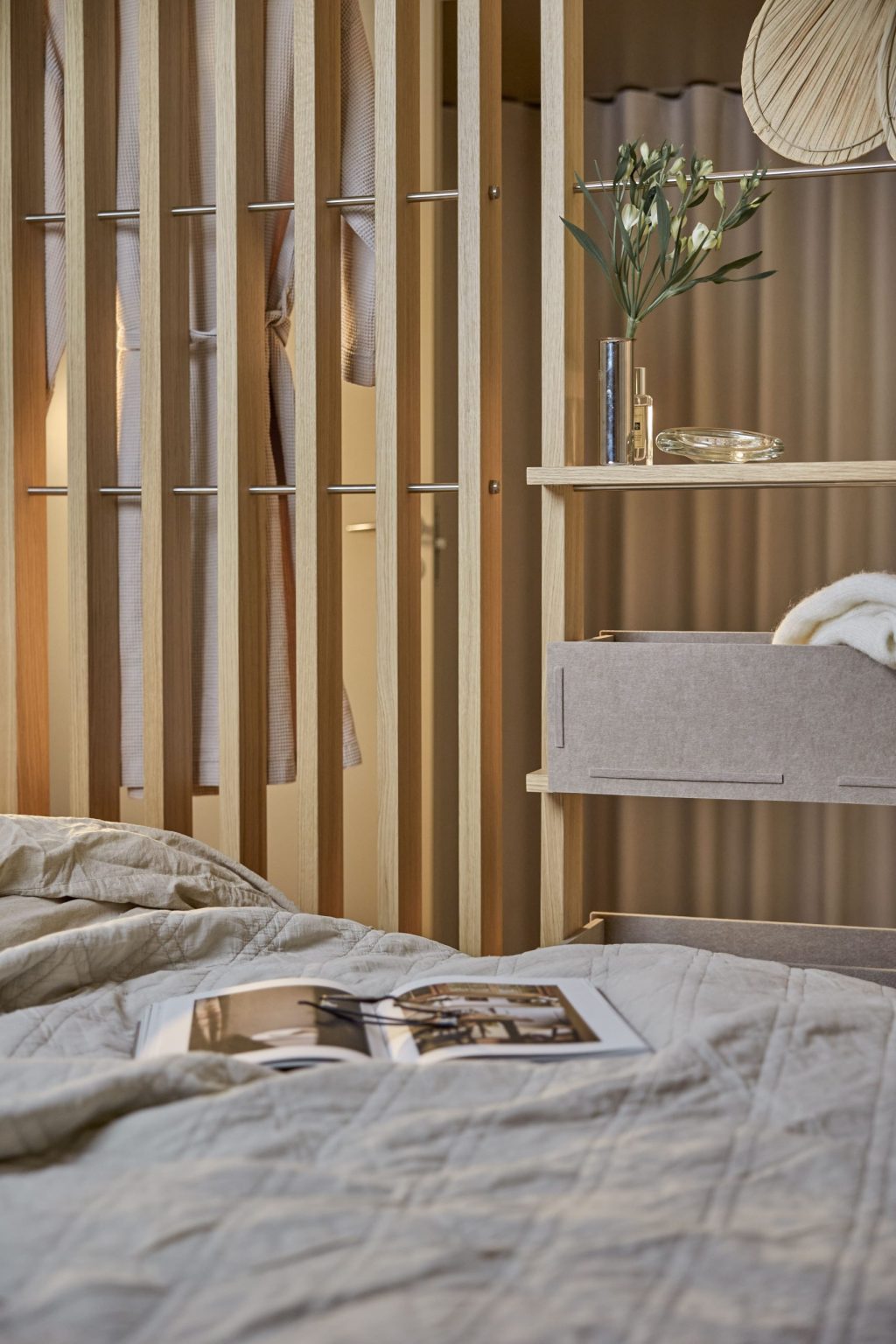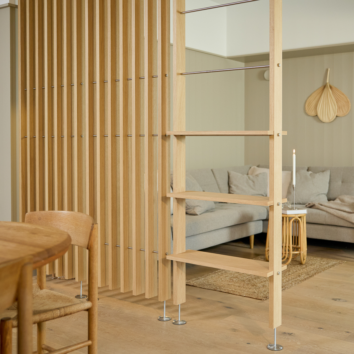 Embrace | BM1 ist eines der beiden Kernmodule im Embrace-System. Hergestellt aus Eichenfurnier und Edelstahl, wird BM1 zwischen Boden und Decke montiert und hilft, klare Zonen mit Struktur und Zweck zu schaffen.