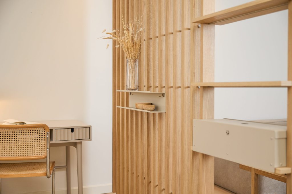 Eine ruhige, geschlossene Aufbewahrung, die wunderbar mit Deiner Embrace Raumtrennwand harmoniert.