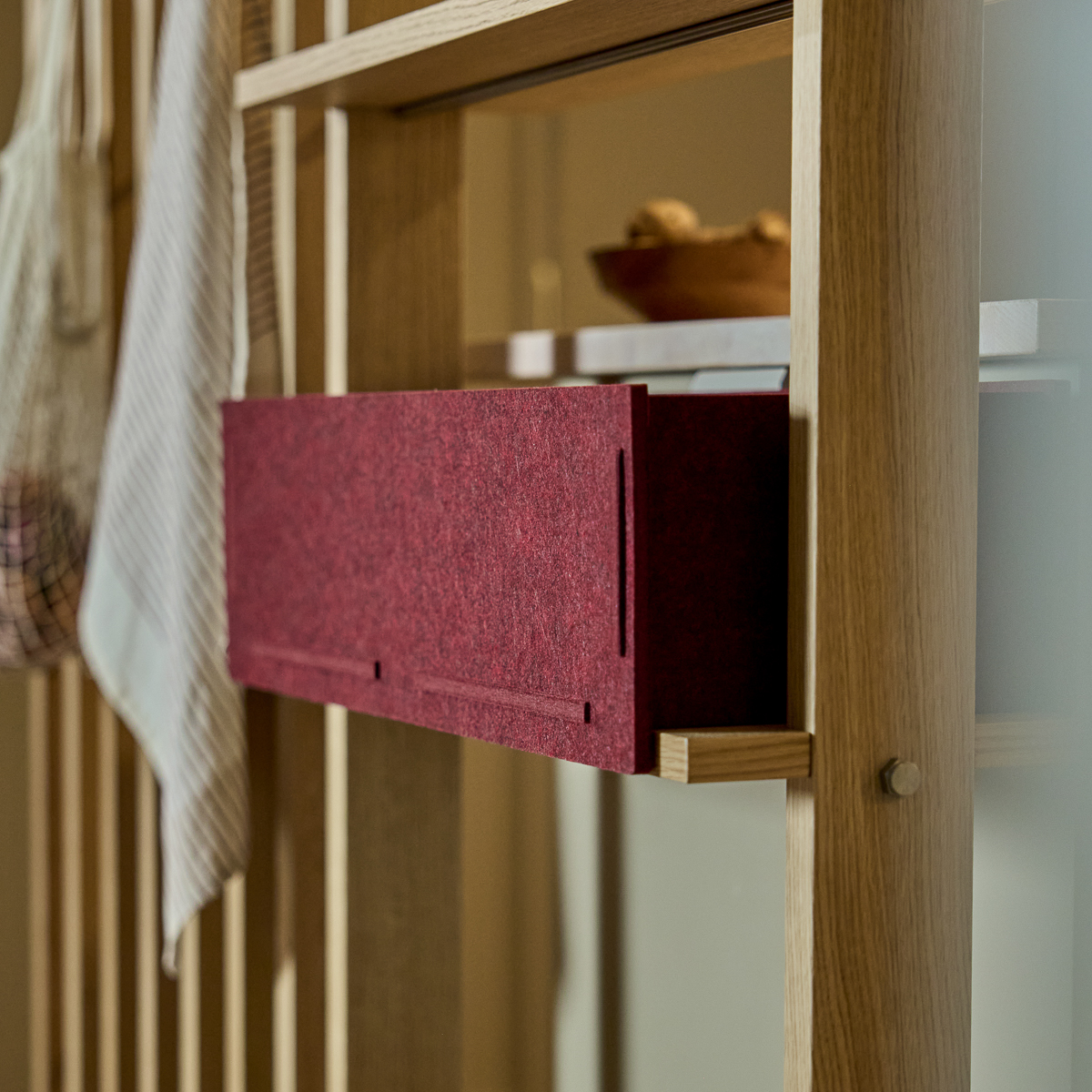 Die Vigg Felt Box ist perfekt für das Lova Holzregal gemacht. Die Größe, der weiche Filz und die sauberen Kanten sitzen natürlich auf dem Regal — verwandeln offene Aufbewahrung in einen ruhigen, organisierten Raum, der leicht zu leben ist.