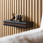 Die Schlüsselablage besteht aus schwarzem pulverbeschichteten Stahl mit einer versteckten Schublade aus geräuchertem Kork. Sie lässt sich mit den mitgelieferten Halterungen ganz einfach an den Akupanels befestigen und sorgt dafür, dass kleine Alltagsgegenstände wie Schlüssel, Brillen oder Ladegeräte unsichtbar verstaut sind – ohne zusätzlichen Platz zu beanspruchen.